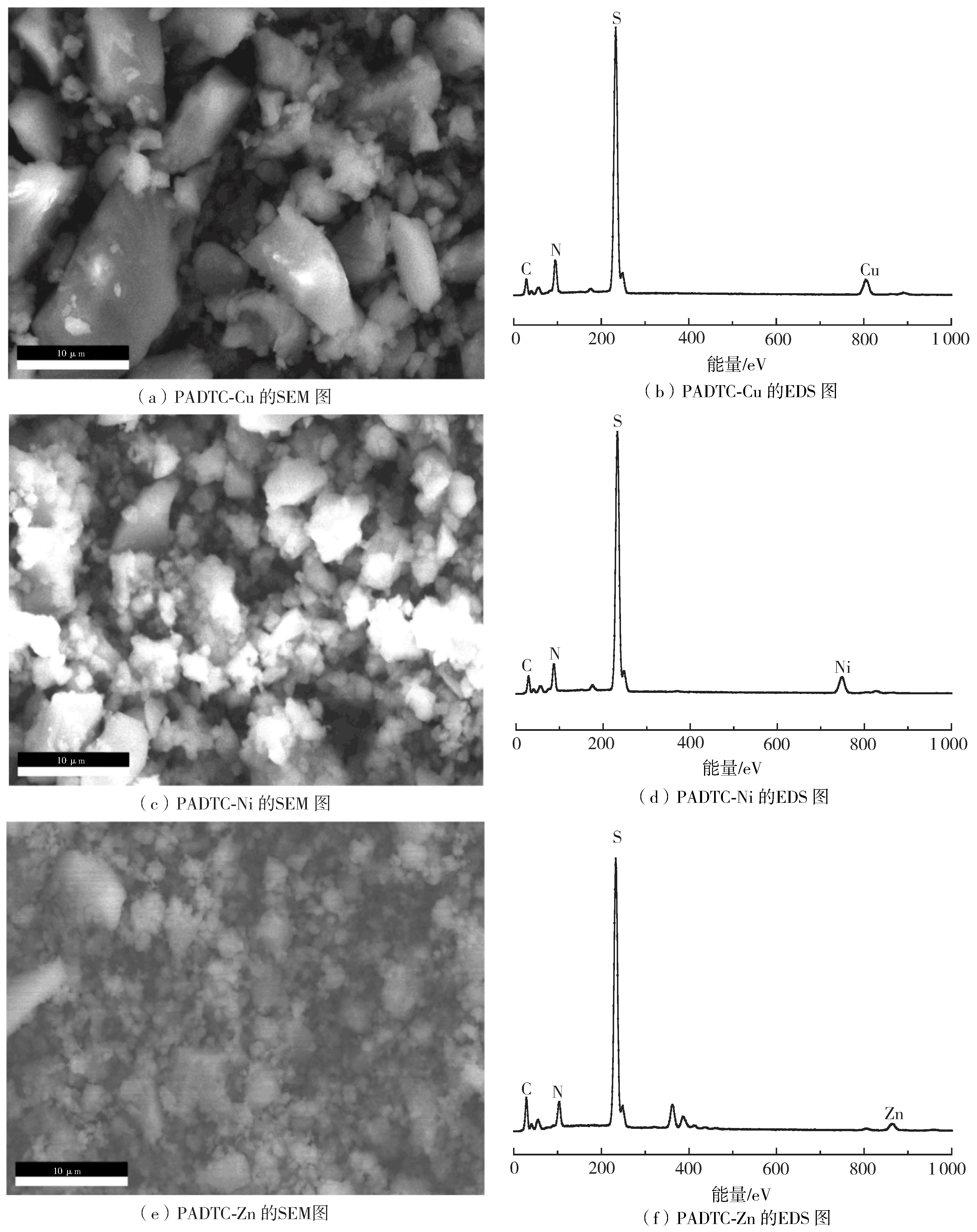 沉淀PADTC-Cu、Ni和Zn的電鏡掃描-能譜(SEM-EDS)分析如圖6所示,沉淀PADTC-Cu、Ni和Zn的電鏡掃描圖6(a)、(c)、(e)均顯示沉淀表面疏松多孔。其對應的能譜圖上分別有Cu、Ni和Zn元素峰出現,與 PADTC的元素分析相比較,Cu、Ni和Zn元素峰的出現表明PADTC捕集到了重金屬離子Cu、Ni和Zn 。