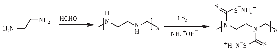 制備PADTC的基本反應方程見式(1)。乙二胺和甲醛縮合形成聚合物,然后發生親核反應,在堿性條件下與二硫化碳形成聚-二硫代氨基甲酸銨鹽(PADTC)。