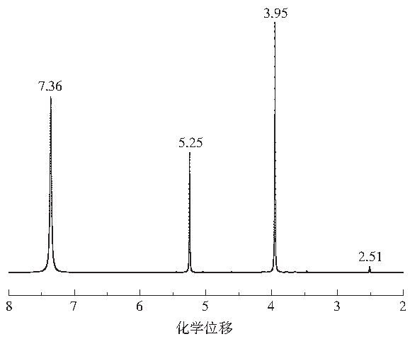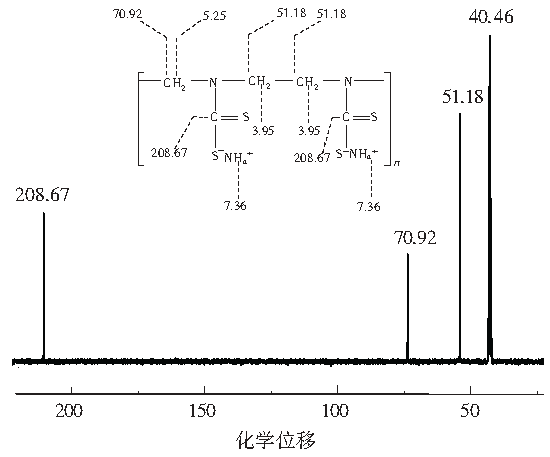 PADTC的1H和13C核磁共振光譜如圖2和圖3所示。在圖2氫譜中,化學位移為5.25、3.95、7.36的峰分別屬于—CH2、—CH2—CH2和NH4+中的氫。在圖3碳譜中,70.92、51.18和208.67的化學位移屬于—CH2、—CH2—CH2和—S—C═S中的碳。