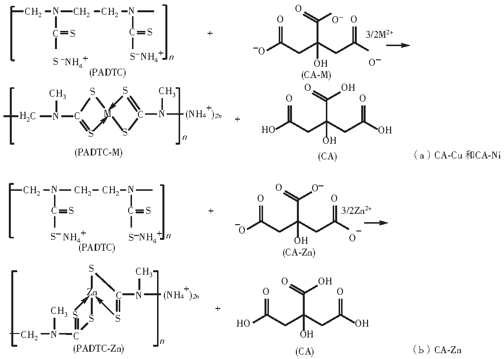 以絡合劑CA為例,PADTC抓捕重金屬的機理如圖5所示(其中M 代表Cu 或者Ni)。銅原子的原子序數為29,其失去3d軌道和4s軌道的2個電子后形成銅離子,銅離子在與PADTC形成配合物時,采取dsp2雜化軌道成鍵,構型為平面四方形結構,中心離子銅的配位數為4,機理如圖5(a)所示。Ni的電子結構為3d84s2,失去4s軌道上的2個電子后形成鎳離子。當PADTC抓捕鎳離子時,鎳離子的8個3d電子發生重排,空出一個d軌道與4s和4p軌道雜交成dsp2軌道。雜化軌道為平面四方形結構,所以PADTC-Ni 是平面正方形。反應抓捕機理和銅類似,也是形成平面正方形,如圖5(a)所示。Zn 的電子結構為3d104s2,失去4s軌道上的2個電子形成鋅離子。當與PADTC反應時,鋅離子的3d軌道是飽和的,因此,形成sp3 軌道,構型為正四面體結構,中心離子的配位數也為4,抓捕機理如圖5(b)所示。