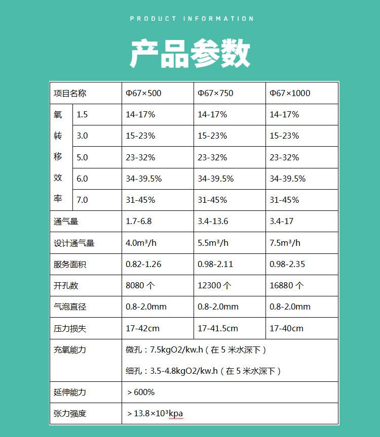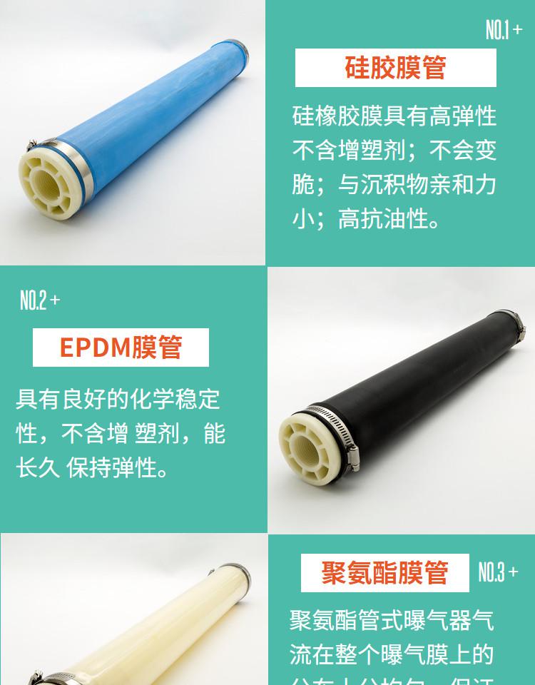 曝氣膜管采用三元乙丙橡膠(EPDM)材料,具有耐熱、耐臭氧、耐酸堿、化學穩定性好等特點,與一般橡膠膜相比,可大大提高其使用壽命。